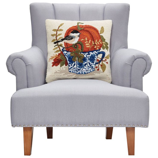 Fall Bird, Pumpkin, Leaves and Teacup Wool Hooked Pillow 18"x18"