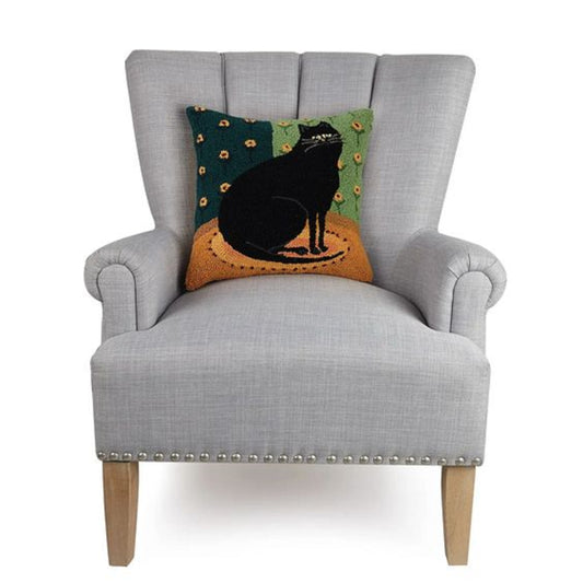 Folk Art Primitive Black Cat Hooked Pillow 16"x16"