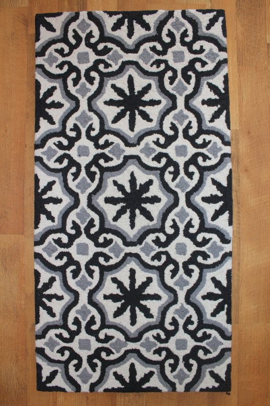 Primitive Farmhouse Wool Hooked Rug 24" x 48" Black/Gray/White