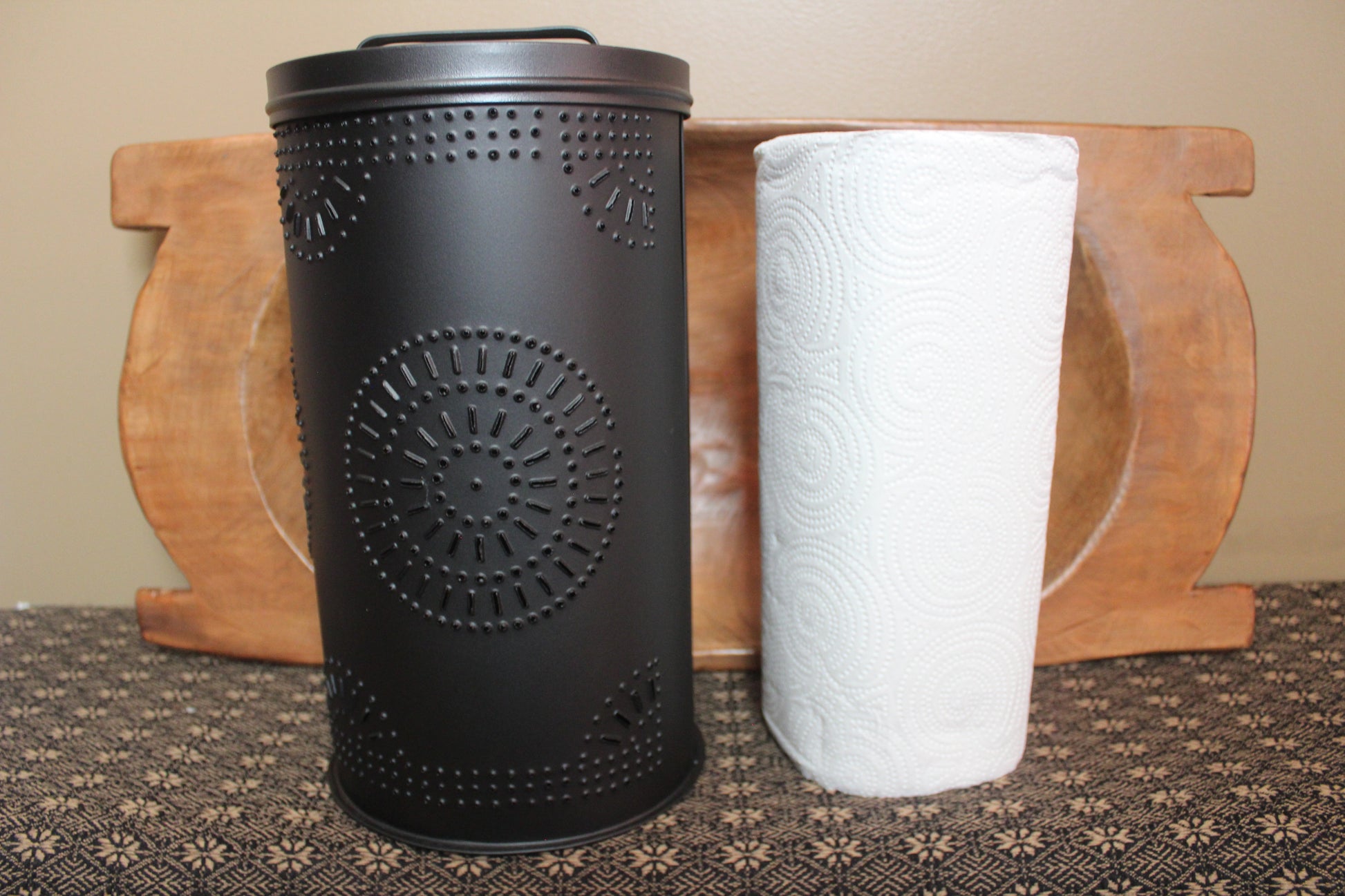A beautiful way to disguise your needed paper towels on the kitchen counter. This Punched Tin Paper Towel Dispenser is a beautifully statement of Primitive simplicity.
